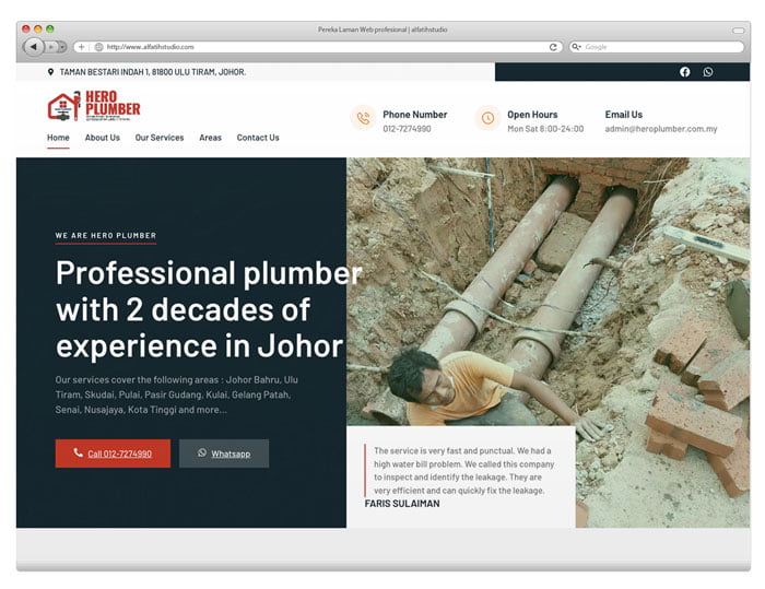Case detailsWebsite jenis Company Profile untuk syarikat Hero Plumbing company. Sebuah syarikat yang menawarkan perkhidmatan plumbing, paip dan pembinaan di kawasan sekitar Johor. Memerlukan design web yang clean dan modern, menumpukan pada paparan mobile.